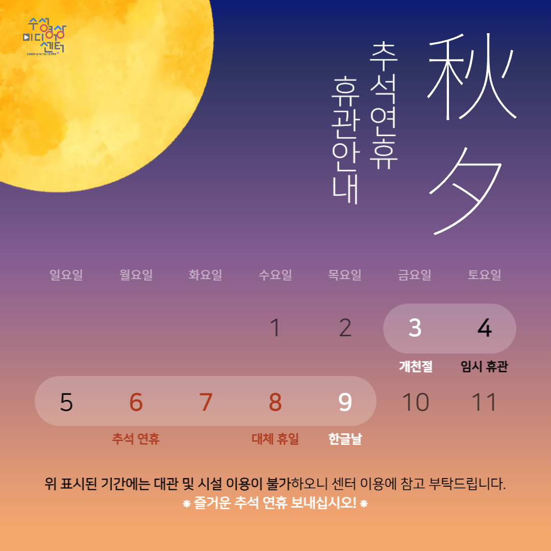 10월 추석 연휴와 공휴일 등으로 인한 센터 휴관 안내드립니다.