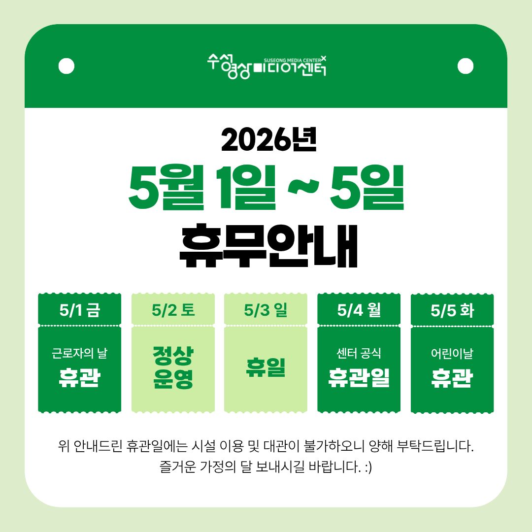 [수성영상미디어센터] 5월 1일(금) 근로자의 날, 5월 5일(화) 어린이날 휴관 안내